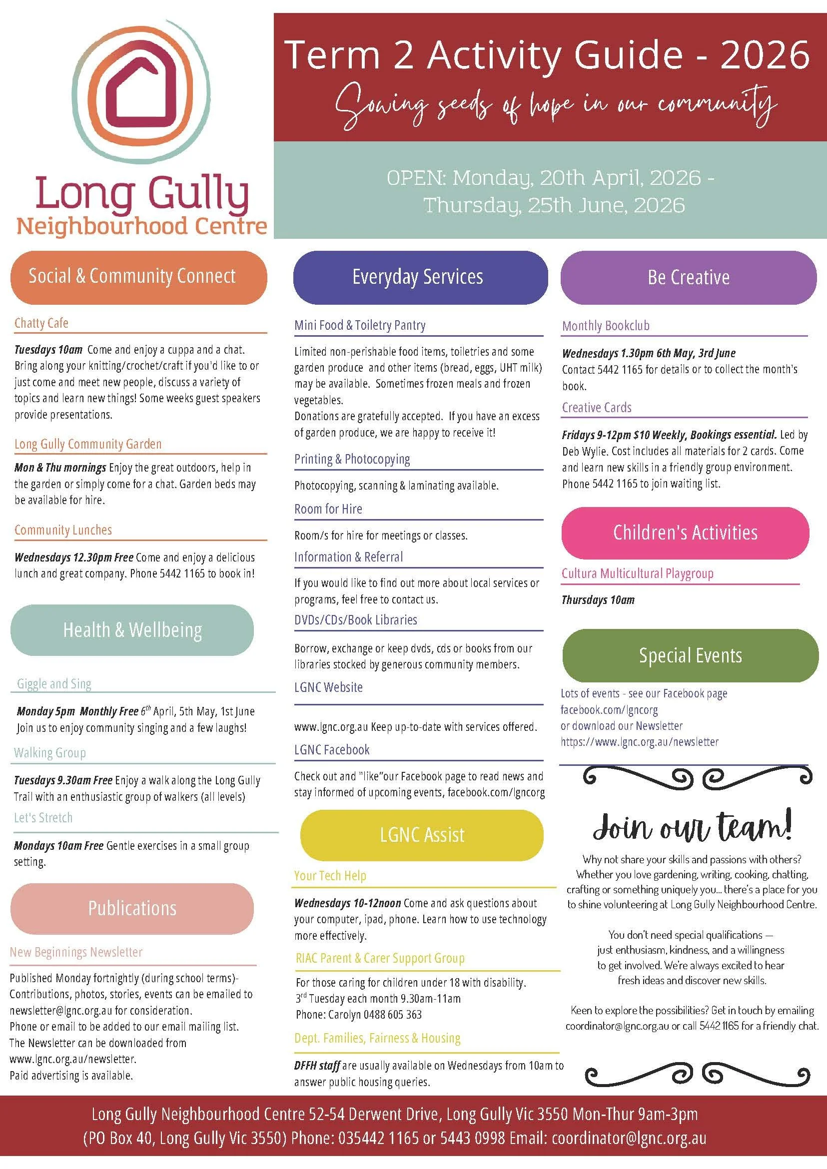 New to Long Gully? You can pick up a printed copy of the Community Directory from us at LGNC, 52-54 Derwent Drive, Long Gully or download a copy below.